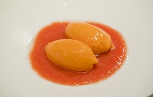 - ◯「ル シュマンプラス コース」(¥14,300)より、メインの「小鳩のロティ ルーアン風」。別皿で、付け合わせと小鳩のモモ肉を使った料理が運ばれる。◯夏~秋口に登場する前菜「赤ピーマンのムース クーリドトマト」。◯白を基調とした店内。ドリンクは、シャンパーニュ+ワイン2杯のお得な「デギュスタシオン」(¥4,950)をぜひ。