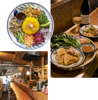 軽やかな自然派ワインと - フレンチの技法を取り入れて無添加・無化調で作るベトナム料理を、フランス産を中心とした自然派ワインと楽しめる人気店。現地ではおやつとしてよく食べられるベトナム風ピザを、たっぷりの野菜やハーブで巻いていただく「ライスペーパーピザ」は、秋に登場した新メニュー。ワインと相性抜群の、甘み、酸味、苦み、辛みが一体となった「完熟マンゴーとエビのサラダ」もぜひ。
