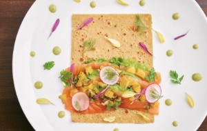 - ○月替わりのディナーコース「プロムナード」(¥9,000~)より、「エゾ鹿のロースト」。赤ワインやタイム、鹿のフォンを使用したやや酸味のあるソースでいただきます。○奥さまの地元・長野の食材も積極的に取り入れます。こちらは前菜の信州サーモンと長野産そば粉のガレット。盛り付けの美しさにもこだわります。○落ち着いた雰囲気の店内。いずれワインイベントも行いたいのだそう。