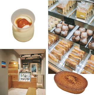 - ○塩みの効いたほろ苦いソースがポイントの「塩キャラメルソースのプリン」(¥390)。○ショーケース内のスイーツは日替わり。○発酵バターをじっくり焦がして北海道産小麦粉と合わせた「焼きたてフィナンシェ」(¥280)は、外側カリッと、内側はしっとり。一番人気の商品です。