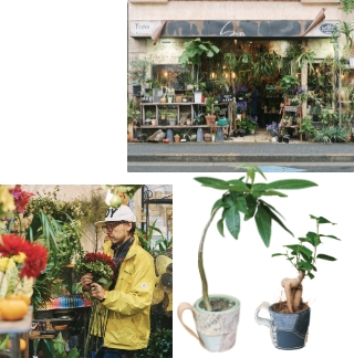 - ○店頭の生命力あふれる植物に思わず足が止まります。店名は、健介さんが35年続けるバンド名に由来。○花束やアレンジメントの注文は3~4日前までの予約制。○下北沢にあるリメイクスニーカーショップ「ライプリーズシュガー」とコラボしたプランツカバー。靴作りの過程で出た革や布を組み合わせた一点ものです。植物込みで各¥2,750。
