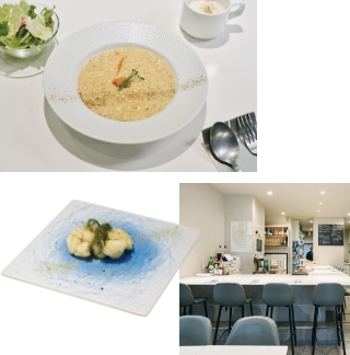 - ○ランチタイムにはミニサラダとスープが付く「生ウニとフルーツトマトのリゾット」(¥2,300)。ウニの風味がより引き立つよう、甘みの強いフルーツトマトを使用。○トロッと濃厚な「白子のフリット」(ハーフサイズ¥840)。熊本県天草産のすじ青のりとナッツ入りのミックススパイス・デュカを添えて。○スタイリッシュな店内にはカウンター席のほかテーブル席も。