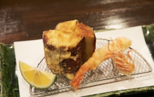 - ○ほんのり温かい「手作り豆腐」(¥780)は、国産大豆の濃い風味が感じられる逸品。薬味なしでもおいしくいただけます。「本日のお作り3品」(¥1,500)。○「おまかせ9品(¥5,800)」にも組み込まれるさつまいもと車海老の天ぷら。料理はアラカルトでも注文可能。○加藤さんとの会話も楽しめるカウンター席のほか、テーブル席も。