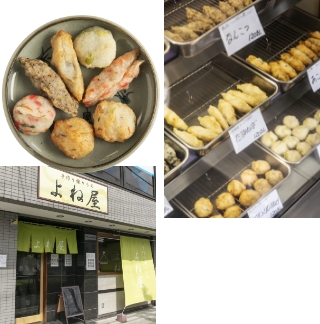 - ○上から時計回りに「枝豆」「桜えび」「もやし入りかきあげ」「たくあんこんぶ」「ジンジャー」「なんこつ」「おこのみ」各¥120。○季節や日によって異なるラインアップはInstagramで発信中。味に加え、店主の人柄も「よね屋」が愛される理由です。駐車場がないため、来店時は注意。