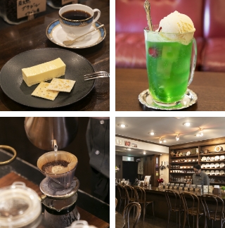 - ○リッチな味わいの「濃厚チーズケーキ」(¥400)、苦みのあるブラジルをベースに4種の豆を配合した「炭火煎Coppiaブレンド」(¥600)。○どこか懐かしい「昔ながらのクリームソーダ」(¥600)。○柴田さんとの会話を楽しみに訪れる人も多いそう。ソファ席もあり、子ども連れでも気軽に利用できます。
