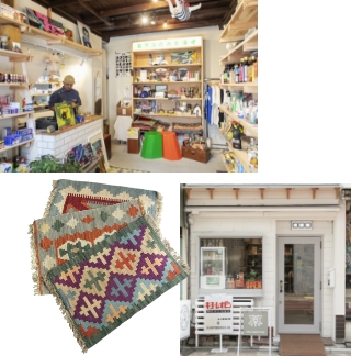 - ◯清瀬にある「あくつ薬局」の3代目でもある阿久津さん。ご実家から譲り受けた古道具もちりばめられています。◯すべて一点ものの「キリム」(小・各¥12,000)。友人や家族のつながりからセレクトしたアイテムも多いのだそう。