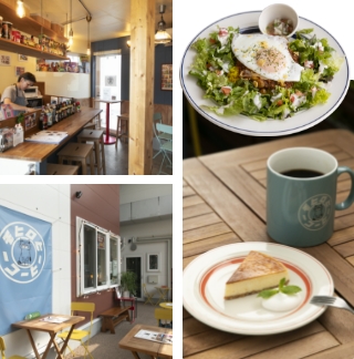 - ◯沖田さんが集めたアメリカントイが並ぶ店内、テラス共にペット可。犬連れの方も多いそう。◯スパイスで深みを出しながらも辛みを抑えた「タコライス」(¥1,400)。◯レモンで爽やかに仕上げた「チーズケーキ」と、大きなマグカップに注がれる「ドリップコーヒー」。セットで¥1,200。