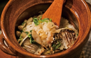 この日のコースで提供された土鍋ご飯のふたを開けたとき、ふわっと広がったのは、下村さんが試行錯誤を重ねてようやく完成した〝炭油〞の香ばしい香り。