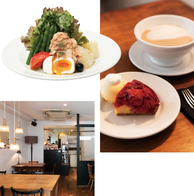 - ○彩りが美しい「ニース風サラダ」(¥1,440)は、シンプルだからこそ素材の味が引き立つ看板メニュー。○香ばしい全粒粉入りの生地にカスタードとアーモンドクリームをのせ、たっぷりのいちごと焼き上げた「焼きいちごのタルト」。香りがよく濃厚な「ミルクティー」とのセットで¥1,950。