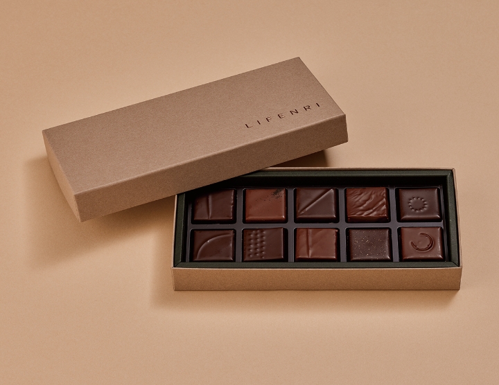 - 時間と温度管理を徹底して作る、シェフ自慢の「ボンボンショコラ」(10粒アソート¥4,320)。ペルー70%、アールグレイ、オランジュ、プラリネノワゼットほか、いろいろなテクスチャーが楽しめるラインアップが魅力。