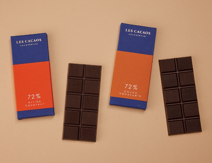 - 左から、エクアドル産カカオ72%の「タブレット アリバ」(¥1,100)、ベネズエラ産カカオ72%の「タブレット チュアオ」(¥1,100)。農産物であるカカオは収穫年によって味や香りが変化するため、毎年食べ比べる楽しみも。