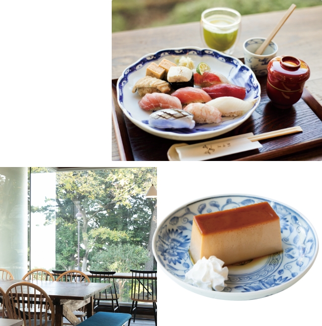 - ○赤酢と米酢、砂糖を混ぜたまろやかなシャリに、ひと手間加えた四季折々のネタを合わせた「小僧の神様の握り鮨」(¥5,000)。醤油を塗るために添えられた刷毛も、ゆっくりとした時間を演出するアイテムです。○しっかり固く仕上げた「お鮨屋さんのプリン」(¥680)は1日6食限定。喫茶のみでも気兼ねなく利用できます。