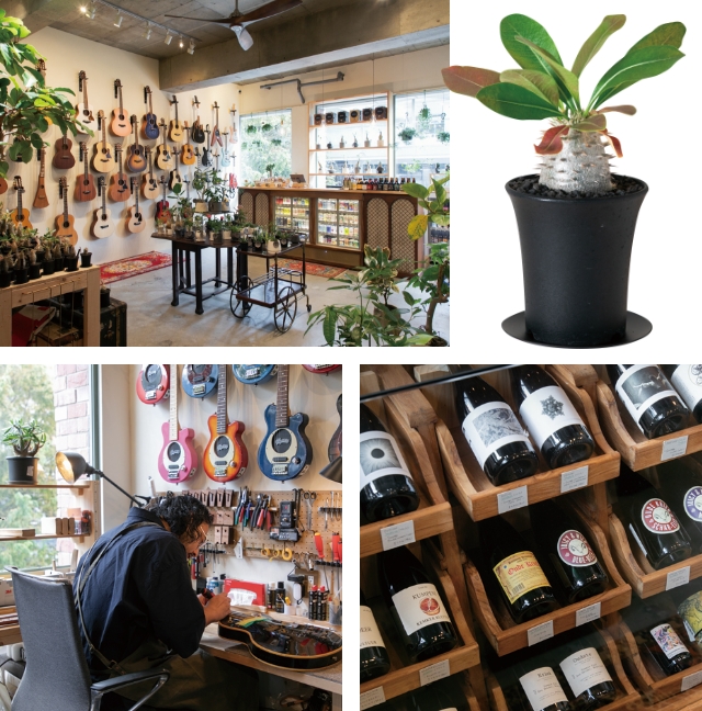 - ○イチオシの観葉植物は、ぷっくりとしたボディにトゲトゲが個性的な「稲穂園芸店」のパキポディウム(¥2,200~)。○岡本さんはギターブランド「Taylor Guitars」の公式リペアマン。店内では同ブランドの新品に加え、岡本さんが修理・クリーニングした中古のギターも販売します。○野生酵母系のビールが豊富。角打ちスペースも。