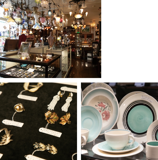 - ○英国ヴィクトリア朝期のアンティークから戦後のヴィンテージまで、幅広く揃う店内。○ため息が出るようなアンティークジュエリーのほか、ファッション性の高いコスチュームジュエリーも豊富。現代にはないデザインに心が躍ります。○食器コーナーの一角で見つけた「スージー・クーパー」の陶器。和食器やヨーロッパの窯元で作られたシノワズリ(東洋趣味)の作品も。