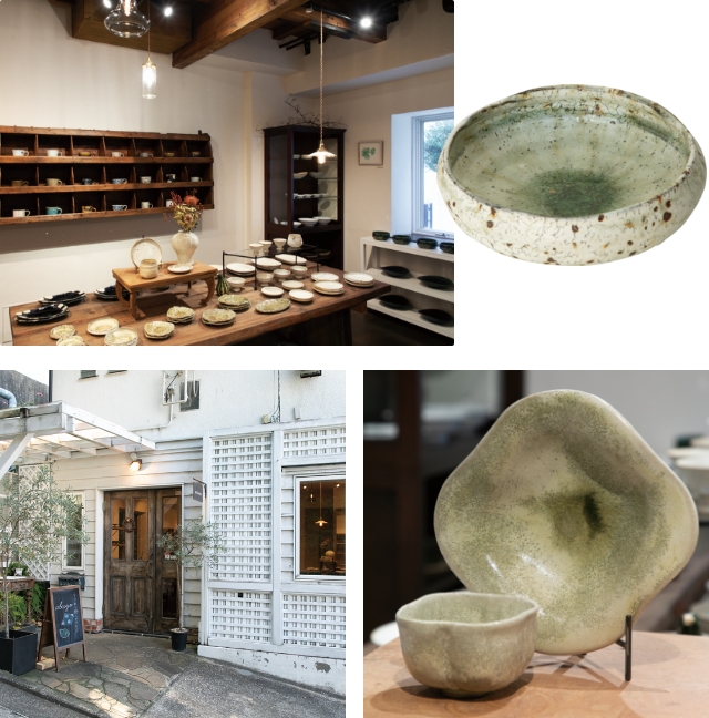 暮らしのための器を提案 - にぎやかな商店街から離れ、山手へと続く汐汲坂の途中にたたずむお店。扱うのは、人の手のぬくもりが感じられるような日本の作家もの、窯ものの器。「あくまで日常に寄り添う器屋でありたい」と、ギャラリーのように一点ものだけを置くのではなく、幅広いテイストの器を常時取り揃えます。展示会は月に1回ほど開催。ガラス製品やカトラリーも充実しています。