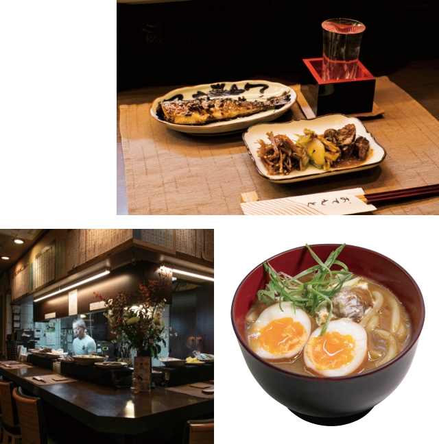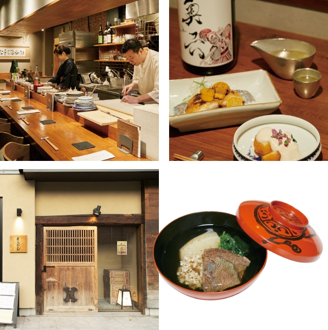 - ○大皿料理から選べる「前菜三点盛り」(1人前¥660)、「イワシの山椒煮」(¥770)。日本酒は¥660~。○現在は4代目の奥さまと息子さんが二人三脚で切り盛りします。店内はカウンター席のみ。当日でも予約がおすすめです。○飲んだ後の〆にぴったりの「合鴨のつくね入りカレーうどん」(ハーフサイズ・玉子入り¥880)。