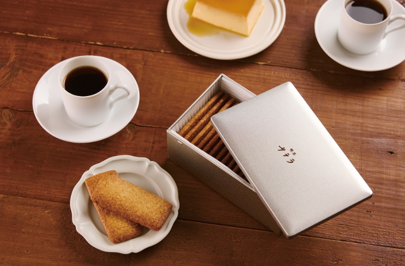 渋谷で48年愛されてきた喫茶店「青山茶館」。そのレトロな面影を受け継ぎ、2020年にオープンした「喫茶サテラ」もまた、香り高いコーヒーとフードになごむ人々の憩いの場になっている。サテラのスイーツといえばまろやかなプリンが知られているけれど、新たに仲間入りして話題をさらっているのがクッキー缶。理想を求めて試行錯誤を繰り返すこと4年ほど。素材、配合、混ぜ方、焼き加減など、あらゆる組み合わせを試して、ついにシンプルにして究極のクッキー缶が完成したという。ふたを開けるとバターの幸せな香りがふわり。中に収まるのは潔く1種のみで、飾り気ない長方形のクッキーは、選び抜いたフランス産発酵バター、カソナード(フランスのブラウンシュガー)、ゲランド塩などを使い手作りされる。黄金色の一枚を頬張るとザクホロ、クリスピーと儚さが共存する心地いい食感。香ばしさと深いコク、甘さ、塩気のバランスが絶妙で素朴でいて上品。伸ばす手が止まらなくなってしまう。これまで周年記念などで出ることはあったが、さらに進化して完成。 10月にお目見えするや瞬く間に人気となった「クッキー缶」¥3,680。昨夏からテイクアウト用「プリン」(¥550)もスタート。