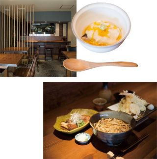 - ○自家栽培の柚子がほのかに香る、天麩羅そば¥1,700。甘辛い味つけの「鴨鍬焼き」(¥1,200)や自家製の佃煮(¥300)など、酒の肴も充実。日本酒は¥600~。○山葵をピリッと効かせた「甘鯛の蕪蒸し」¥1,000~ 1,200(時価)。