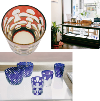 - ○オリジナルの紋様が魅力の「蒲田モダンGUINOMI」シリーズ¥7,560~。 ○観光庁主催「魅力ある日本のおみやげコンテスト2012」でLUXURY JAPAN賞を受賞した「蒲田モダン水鏡」¥16,200。