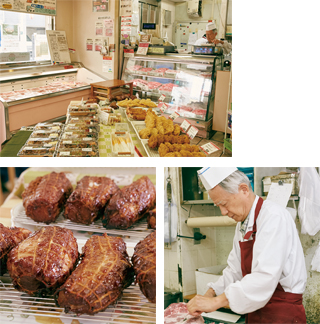 - ○3日間漬け込んでその日の朝、仕上げる焼豚(¥1,200)。○御歳75歳、今でも現役の名物店長、小林昭夫さん。○店頭に並ぶ総菜と、和牛や「館ヶ森高原豚」のお弁当も大人気。取り置きも可能です。