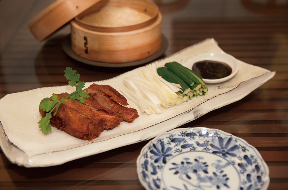 北京の家庭で、会食や記念日などの特別な日にもてなす料理といえば、「揚げ鴨の薄餅包み」1/2羽4千6百円。宮廷料理として一般に知られる北京ダックとは似て非なる逸品です。料理のこだわりについて店長の後藤政浩さんは、「鴨肉をネギや香味野菜とともに特製ダレに漬け込み丸1日寝かせた後、約5時間蒸してスパイスをなじませます。最後に油でカラリと揚げると、肉にしっかりと味が染み込んで、深みのある味わいになるのです」と、語ります。