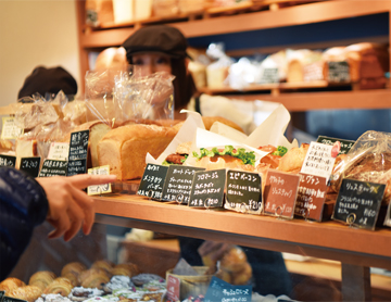 - ショーケースに並ぶパンはなんと100種類以上!豊富なパンが所せましと並びます。その約8割は、8時までには出揃うというから嬉しい限りです。残念ながら朝は並びませんが、特に種類が多いのは食パン。「焙煎玄米食パン」など日替わりの食パンがあるほか、型に入れず直焼きする「直食」パンは、水分が多く、新感覚の食感が楽しめると評判に。店のワンコーナーには、卵や低温殺菌の牛乳、もち豚のハムなど、朝食に食べたい品も。パンとともにどうぞ。