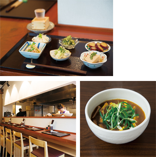 - ○季節限定の日本酒とともに、さつまいもの甘煮、高野豆腐、ふきのとうの天ぷら、おからなど、旬の小鉢を味わえます。○ここに来たら一度は食べてもらいたい「特・夢カレーうどん」¥1,500。