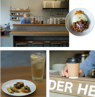 - ◯ひよこ豆の優しい味わいとスパイスが絡み合う「チャナマサラ」¥850。◯スターアニスを漬け込んだハイボール(¥600)。食材ごとに漬け込むオイルとスパイスを使い分けるアチャールはイワシ・ブナシメジ・ゴボウをチョイス。◯コーヒーは、テイクアウト可能。