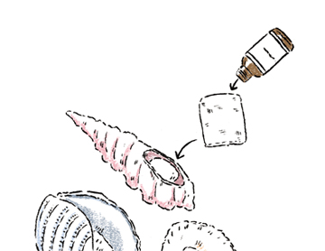 - 小さな貝殻(巻貝など)にコットンを詰め、隙間に垂らして。サシェとしてバッグなどに入れると香りが移ります。