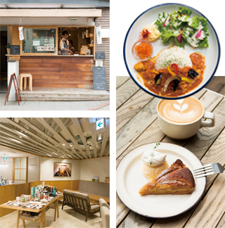 - ○ランチの定番「バターチキンカレープレート」(¥1,080)。○カフェラテ(ホット ¥650)はスッキリとした豆の味わい。自家製「焼きりんごタルト」(¥550)は、+¥200 で「アイスクリーム&生クリーム」をトッピング。○入口にスタンドつき。○地下スペースの診療室とテーブル席。
