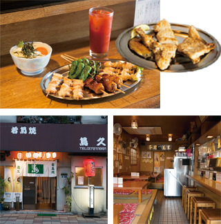 - ○ひと皿に盛り合わせた「ねぎま」(¥315)、「つくね」(¥315)、「鳥軟骨」(¥408)、「ししとう」(¥402)。すべて3本セットの価格です。ヘルシーで老若男女に人気の「トマトハイ」(¥500) と青森産の「長芋の千切り」(¥458)もおすすめ。○「手羽焼」(¥800)。脂の乗った手羽先やコリコリとした食感のやげん軟骨、みずみずしい胸肉など、部位ごとのおいしさを味わえるひと皿。
