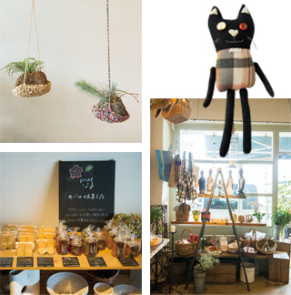 - ○服飾作家「ウォンカ」としても活動するジュンコさんが作る布小物やアクセサリーも販売。ネコのぬいぐるみ(¥5,940)。○生花が迎える店内。2階では花生けのレッスンも開催。○「エアプランツのハンギング」(¥3,500)。植物を使ったオリジナルアイテムにもセンスが光ります。○ 素朴なおいしさの「めぐみ焼き菓子店」の焼き菓子も販売。