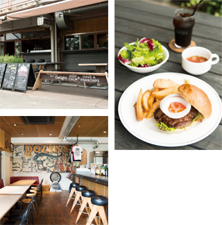 - ○ビーフ100% にこだわったパテをふかふかのバンズで挟んだハンバーガー(¥1,380)はランチの定番メニュー。フライドポテト・サラダ・スープ・ドリンクがつきます。○壁一面の壁画とインダストリアルスツールが印象的な店内。○屋外が気持ちの良いこの季節はテラス席もおすすめ。