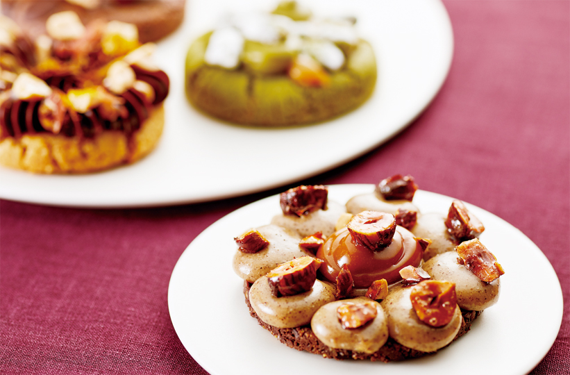 クッキーにも新たな波が。「LESS」のクッキーはガナッシュやキャラメルが美しく絞られ、キャラメリゼしたナッツが艶めく。その姿も、サク、とろ、カリッ……ひと口にいろんな食感があふれるのも生菓子みたいだが、ワンハンドでほおばれて常温OKの気さくさはクッキーならでは。そんな焼き菓子と生菓子のいいとこ取り的クッキーを編み出したのは、2人のシェフ。ガブリエレ・リヴァシェフが新たなクリエーションを直感的に生めば、坂倉加奈子シェフが味や食べやすさを緻密に調整、商品へ落としこむ。世界各地のレストランで経験を積んだ2人、とりわけ光るのが和素材使い。「彼はN.Y.『NOBU』で日本食材を日々使っていて。私は帰国後、『NARISAWA』で自国の食材の素晴らしさを再認識しました」と坂倉シェフ。コーヒーガナッシュとヘーゼルナッツに合わせたチョコクッキーにはそば茶を入れた。コーヒーやナッツの焙煎香が力強く押し寄せた後は、そば茶の余韻がすっと心和ませてくれる。- 手前皿/伊・ピエモンテ産ヘーゼルナッツ、「OBSCURA COFFEE ROASTERS」のコーヒーのガナッシュ、そば茶チョコクッキーに塩麹キャラメルのまろやかな塩味をまとわせた「インテンソクッキー」¥650。奥/右から時計回りに、伊・ブロンテ産ピスタチオの香りを抹茶で引き立てた「ピスタチオクッキー」¥650。スパイスとチョコレートがエキゾチックに共鳴する「ピーナッツガラムマサラクッキー」¥450。チューイーな「チョコレートチップクッキー」(¥400)にはバナナ味のキャラメルをのせて(すべて税抜)。