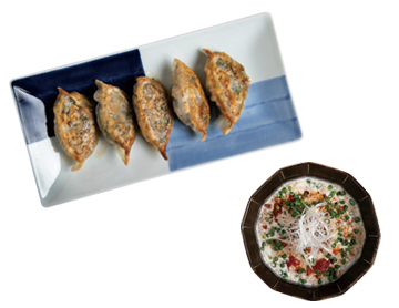 - ○にんにく、または生姜入りを選べる「名物 あおば餃子」¥700。ハーフ(3個)¥400も。○ツルリと喉越しがよく、いくらでも食べられそうな小豆島・真砂喜之助製麺所の太口素麺を使用した「豆乳坦々そうめん」¥1,200(すべて税抜)。