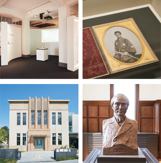 - ○メイン展示室中央の「海舟ブレイン」では、海舟が遺した言葉から心緒と人物像に迫ります。○企画展示室の肖像写真(常設展示)。7月2日より企画展「所用品から見る海舟の姿」を開催予定。○西洋の建築技法を取り入れたモダンな建造物。○当時の造りを復元した「旧貴賓室」にある海舟の胸像。
