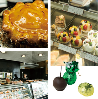 - ○生地から仕込む「アップルパイ」(ホール ¥1,900) は、カルバドスとバターでソテーしたりんごが芳醇。○人気のケーキはお昼にはなくなってしまう日も。○左から、キルッシュに漬け込んだチェリーボンボン「グリオット」(¥309)と、ブランデーに漬け込んだフランス産の栗をチョコレートで包んだ「マロン」(¥486)。どちらも看板メニュー。