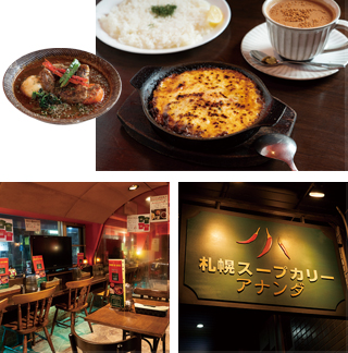 - ○「元祖 やわらか炙り でかチキンカリー」(ライス付き¥1,200)は、ガラムマサラと一緒に煮込んだ鶏肉がやわらかくて絶品。お得な平日ランチセットがあるほかテイクアウトもできます。○「元祖 鉄板 地獄谷キーマカリー・レギュラー」(ライス付き¥1,200)は、こってり飴色になるまで炒めた玉ねぎを使い、卵とチーズをのせて焼き上げたボリュームメニュー。「自家製ホットチャイ」(¥350)。