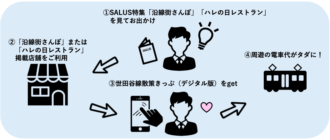 SALUS11月号「沿線街さんぽ」「ハレの日レストラン」掲載店舗(除:豪徳寺、世田谷城阯公園)をご利用・ご飲食された方にデジタル版「世田谷線散策きっぷ」をプレゼントします!