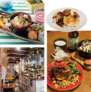 - ○季節野菜の定番プレート「バナネイランチ」(玄米・スープ・ドリンク付き¥1,480)。○バターに似た植物性スプレッドの「グルテンフリー・あんバターパンケーキ」(¥1,480)。○大豆ミートの「ベジバーグタワー」(¥1,280)、ひよこ豆粉の「イタリア風ベジオムレツ」(¥880)、オーガニックビール(¥650)はディナーに。