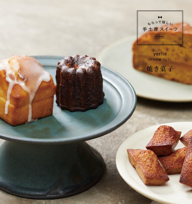 カヌレにフィナンシェ、レモンケーキ……ラインアップは王道で奇をてらわない。なのにひと口でぐっと引き込まれてしまった。どのお菓子にもレストランデザートの経験を積んできた店主・藤井唯さんらしい、おいしい個性が潜んでいる。レモンケーキなら生地や糖衣のレモンだけでなく、生地にレモンコンフィチュール(砂糖を控えた酸っぱめ)をサンド。頰張ればキュンと弾けるような甘酸っぱさに、清香がほんのり。こんなにレモンなレモンケーキはなかなかない。カヌレはカリっとしつつ、その中身はみずみずしいほどレア。銅製の型に蜜蝋を塗り、流した生地をガス火で焼く昔ながらのやり方で。1時間20分ほどと長めに焼くことで見事なコントラストをかなえた。ラム酒を抑えてバニラを効かせるのは、「子どもが積み上げて遊ぶのをイメージしたカヌレなので」と藤井さん。お店の壁にはそんなシーンの写真が。お菓子を楽しむ情景まで表現するのが彼女のお菓子作り。幸せなワンシーンごと贈ろう。手前から時計回りに、アーモンドプードルも焦がしバターもギリギリまで香ばしく仕上げた「フィナンシェ」3個¥390、“落ち込んだ時に元気をくれるレモンケーキ”がテーマの「レモンケーキ」¥390。「カヌレ」¥330。「キャロットケーキ」(¥450)は春夏にはアプリコットジャムをサンド(秋冬はクリームチーズフロスティングがのる)。