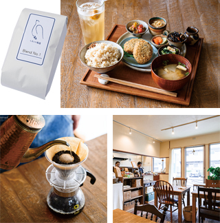 ほっと落ち着ける街の食堂 - カフェのような居心地のよいお店では、一汁三菜の定食とコーヒーが自慢。定食は、無農薬・減農薬栽培の「特別栽培米」を使ったご飯のほかに、地場野菜を使ったおかずにもこだわります。コーヒーは店主のコーヒー好きが高じて、教室へ通ったり、手網焙煎を試したり、試行錯誤を重ねながら自家焙煎の技術を習得。常時14種ほど揃えるコーヒー豆は100gから販売も。