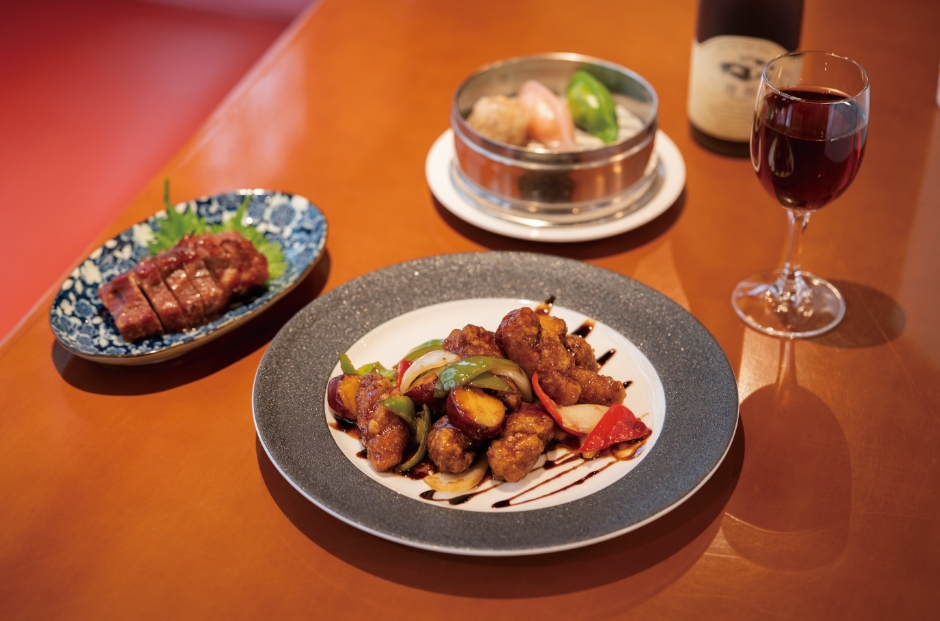 - ○ディナーコースの「スタンダード」(¥4,000)より、メインの「黒酢酢豚」、前菜の「窯焼きチャーシュー」「点心三種」。紹興酒「澄龍」(グラス¥1,600~)。○名物の「ズワイガニのあんかけチャーハン」は、+¥500でコースに組み込めます。○オリエンタルな雰囲気の店内は、1階のテーブル席のほか、2階には座敷も。