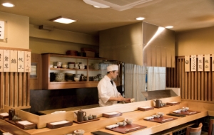 - ◯ディナーコースは3種類(¥6,000~)。「季節の天ぷらコース」(¥8,800)の天ぷらは、この日、天然の舞茸、きのこ、車海老ほか5品。日本酒(1合¥1,200~)。◯天丼や天茶などを選べるコースのお食事は、言わずもがな「うどん」がおすすめ。◯落ち着いた雰囲気の店内は、カウンター席のほか4人がけのテーブル席も。