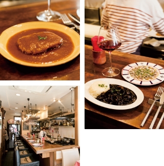 - ◯ナイフがいらないほどやわらかい「トロサ村の伝統料理牛タンの煮込み」(2名¥3,630)、ワイン(グラス¥1,000~)。◯鯛だしで炊いたやさしい味わいのご飯を添えた「イカの墨煮 con アロス」(¥2,970)、常連のリピートが多い「真鰯の酢漬け」(¥1,650)、ワイン(グラス¥1,000~)。◯店内は、カウンター席を中心にテーブル席が1つ。