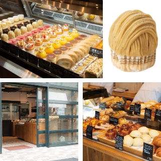 - ○ショーケースにずらりと並んだ華やかなケーキは、この日「ルバーブとチーズのタルト」「ネクタリンと梅酒のサヴァラン」など繊細な仕事ぶりが光るものばかり。○「和栗のモンブラン」(¥750)は、愛媛「米田青果」の栗の甘露煮を栗のクリームで包んだ秋のおすすめ。○パンは、ハード系や食パンなどの食事パンのほかに総菜パンもあります。
