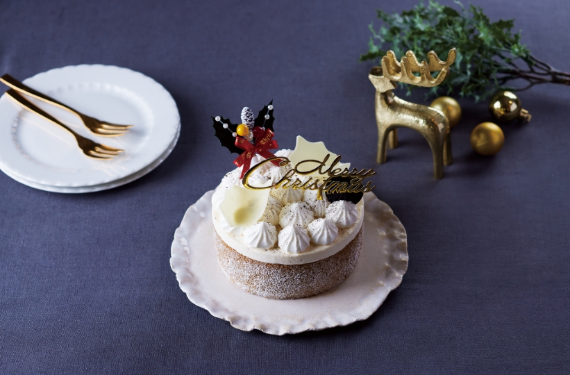「みんながケーキを食べる特別な日だから、複雑な組み合わせよりシンプルにおいしいものを」と「EN VEDETTE」森 大祐シェフ。クリスマスには難しいことなし、老若男女が心躍らせる素直なおいしさへまっすぐアプローチする。だから主役は皆に愛されるバニラと紅茶。おなじみの食材だからこそ、繊細に手をかけて深めていく。マダガスカル産バニラの香りをクリームに移すにも、じっくり時間をかけて香りのボディを引き出すそう。紅茶は華やかなアールグレイをクリーム、ガナッシュ、生地にちりばめ、口溶けの時間差でどんどん香りがふくらむしかけに。口にするとふわっと広がる、バニラムースの乳味と柔らかな香りを背景に、紅茶クリームの淡い香りがミルクティーのように重なる。そこへ紅茶の生地とガナッシュがまったり濃密にとろけ、消えた後も続く余韻がなんとも心地いい。移ろう香りを味わうケーキは、シンプルでいてどこまでもふくよかに聖夜を彩ってくれる。バニラの芳醇な香りと紅茶の奥深い余韻が上品な新作クリスマスケーキ、「テ・バニーユ」¥4,860(直径約12cm/約2~4人用)。紅茶のビスキュイを土台に、アールグレイの濃厚なガナッシュとクリームを軽くなめらかなバニラムースで閉じ込めた。渋谷スクランブルスクエア店限定品。