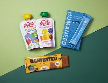 - 左上/フルーツ&ベジタブル100%のオーガニックスムージー。とろみのある口当たりで腹持ちも◎(Frulla Baby Fruit&Vegetablesりんご・バナナ・ほうれん草/¥302、Baby Fruit アップルピーチ/¥280)。右上/ナトリウムやカリウムを含んだジューシーな味わいの経口補水液パウダー。夏の水分補給にピッタリ(ME/NU HUMANEED ゆずレモン4本入り/¥669)。下/南九州産の良質なさつまいも「紅はるか」を使った食物繊維たっぷりの干し芋バー。原材料はさつまいものみ(BENI BITES 干し芋バー オリジナル/¥410)。