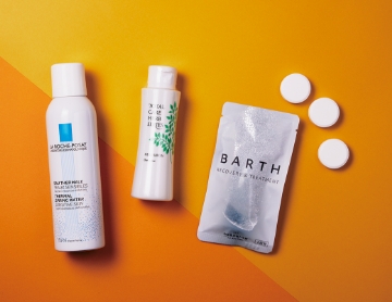 - 左/フランス中西部にあるラ ロッシュ ポゼ村の天然の湧水をボトリングした、赤ちゃんから使えるミスト化粧水。日焼けした肌のクールダウンにも(LA ROCHE-POSAYターマルウォーター150g/¥2,750)。中/肌のpHに合わせた弱酸性のボディソープ。使用後のぬめり感がなく、肌をしっとり保ちます(シェルクルール ハーブシャボン100ml/¥715)。右/体を芯まで温める効果のある中性重炭酸入浴剤。疲労回復や肩こり、冷え性などのほか、夏場に悩ましいあせもにも(BARTH 薬用中性重炭酸入浴剤 3錠/¥396)。
