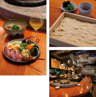 - ○旬をふんだんに味わえる季節の「農園野菜おばんざい盛り」(¥1,980)、やさしい味わいのだしが小腹を満たす「牛バラの肉吸い」(¥980)、グラス・ボトルで提供する「自然派ワイン」(グラス¥900~)。そのほか、ビールやクラフトジンなども。○食事の〆には、生地にシルクを練り込んだ、喉ごし滑らかでコシのある「山形庄内 麦切り」(¥1,200)。○広々とした店内、奥にはテーブル席も。